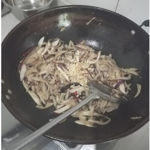 待茄子炒熟后,将姜蒜、盐等作料倒入锅里,并用铲子和匀。
