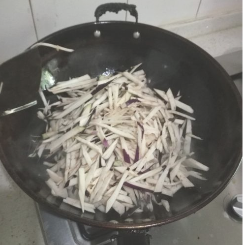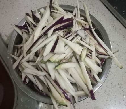茄子用清水洗干净,用刀均匀地切成丝状,装碗备用。
