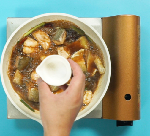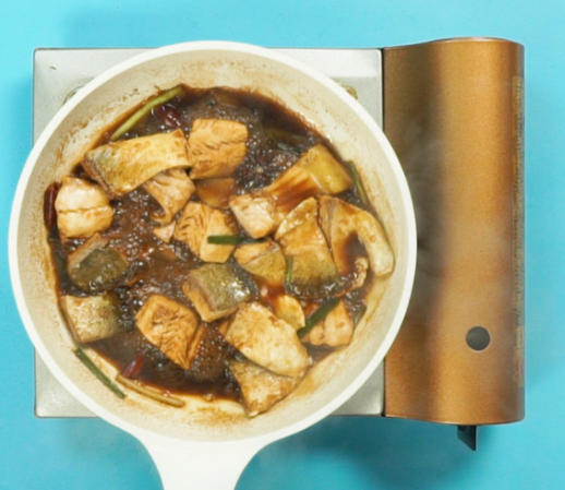 锅入油,依次入姜片、葱段、干辣椒、八角煸炒爆香,再按顺序加入老抽、清水、鱼块,翻炒一下,转中火炖10分钟。