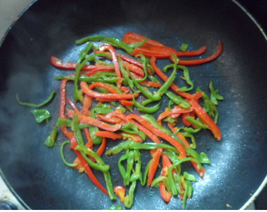 放入炒好的蛋丝、海椒丝、鸡精翻炒均匀。