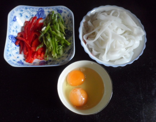 准备材料:河粉、海椒切丝、鸡蛋打散,放点盐拌匀;