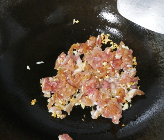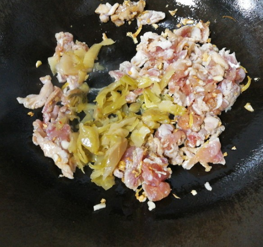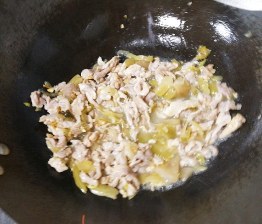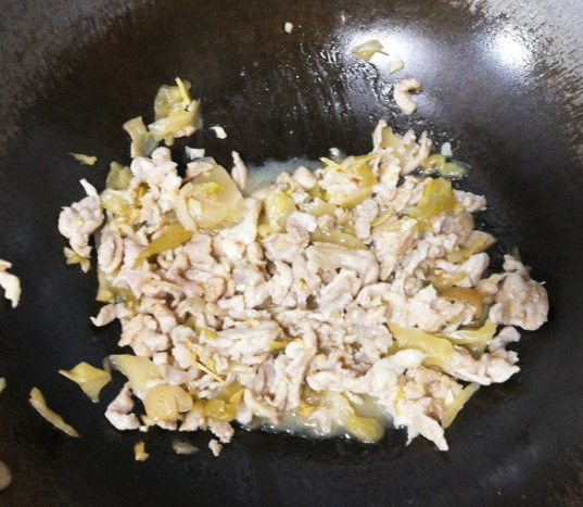 瘦肉大约四五成熟时加入咸菜,继续翻炒;
