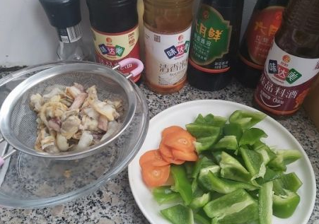 接着将青椒洗净切小块,胡萝卜切点薄片;