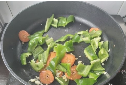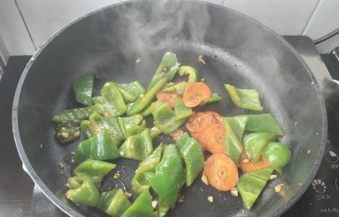 起锅,倒入少许植物油,加入蒜末炒香。然后加入青椒、胡萝卜,大火翻炒;