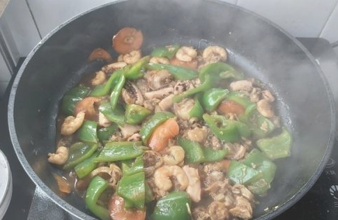 然后加入海杂拌。再次翻炒均匀,即可关火。