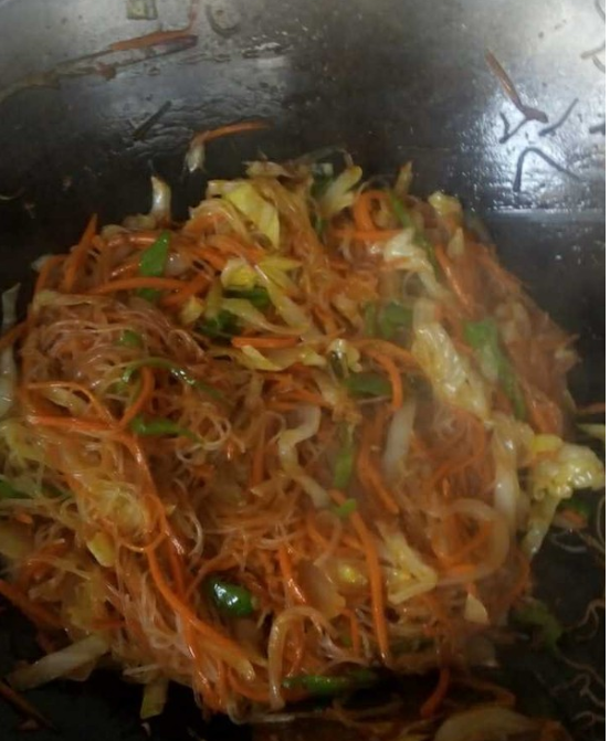 放粉丝爆炒,放盐、味精、酱油,翻炒均匀即可。