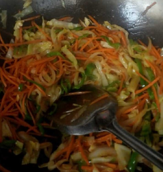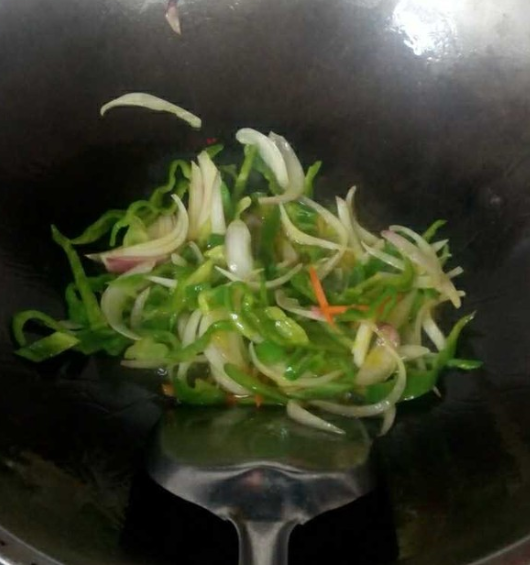 待洋葱,辣椒炒半熟,放包菜;