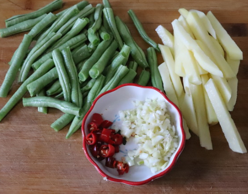 豆角掰成段,土豆起皮切成粗条,小米辣切小段,蒜切末备用;