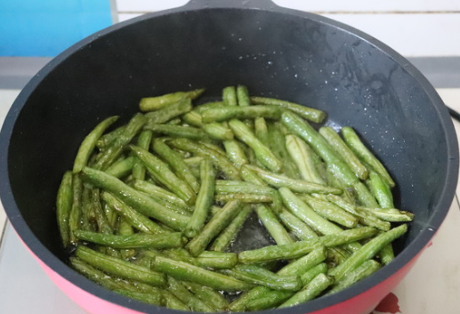 锅中加适量玉米油,下入豆角翻炒到表面起皱捞出;