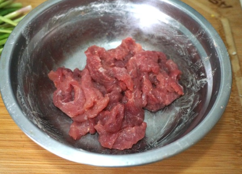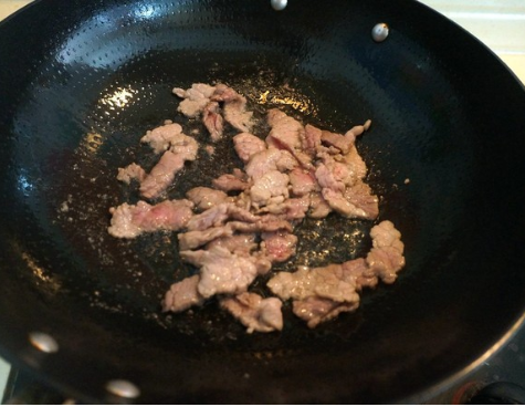 炒锅中倒油,油温五成热时,将肉丝入锅,用铲子尖迅速划散,防止粘连;