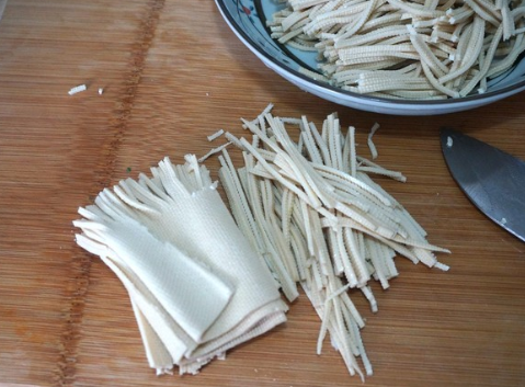 豆腐丝切成7、8公分长,剩下的大片切成细丝;