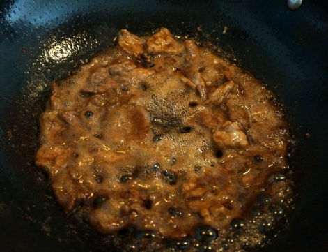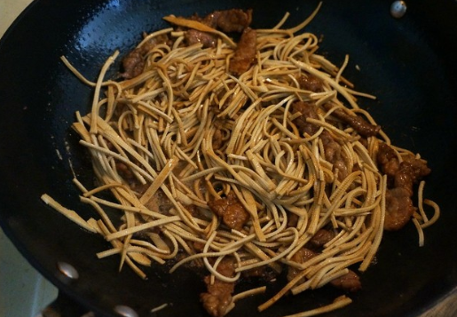 将豆腐丝入锅中翻炒几下,均匀沾上酱油肉汁;