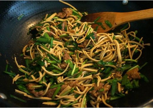 牛肉切细丝,韭菜择洗干净,豆腐丝200克;