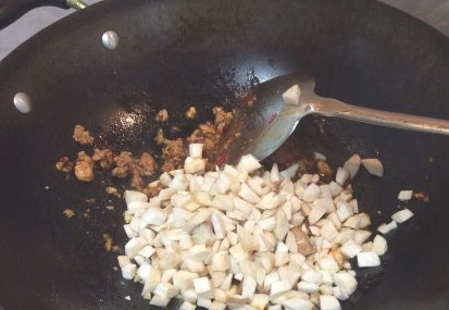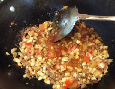 锅中加入食用油,放入姜、蒜、豆瓣酱稍炒下,倒入肉馅一起翻炒,炒香,炒干肉中的水份。加入酱油、醋、白糖调味;