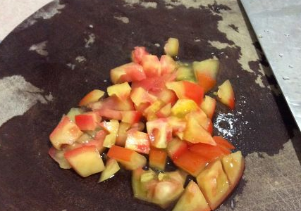 杏鲍菇洗净、蕃茄去皮切成1厘米见方的细丁;