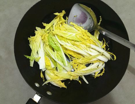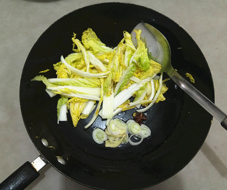 炒出娃娃菜水汽,微微变软,拨到一边,放入葱姜、八角爆出香味;
