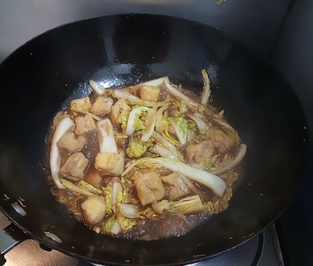 葱姜、八角出香味后放入豆腐泡翻炒均匀;
