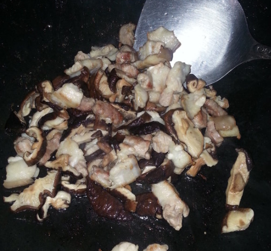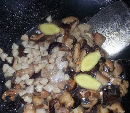 下酱油、姜、味精和一碗水,水煮至半碗让材料熟并让香菇散发香气;