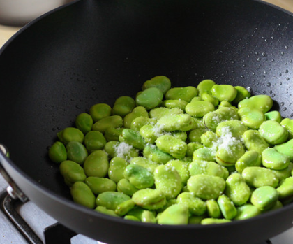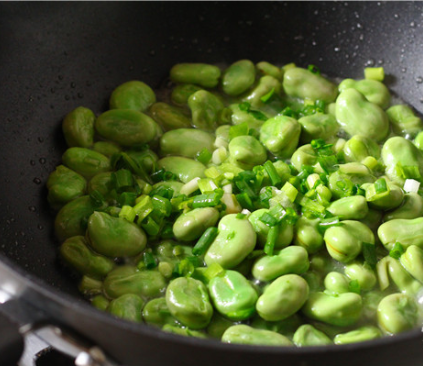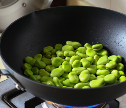 炒锅烧热后放油,下蚕豆快速翻炒;