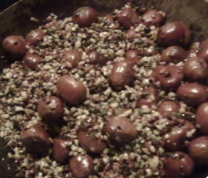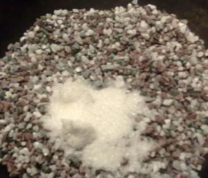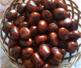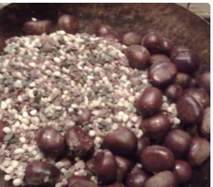 待砂糖与沙子均匀接触后,放入焯好的栗子;