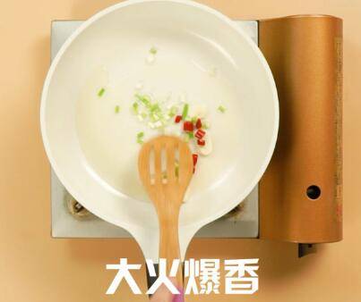 倒入食用油,放入蒜片、葱花、辣椒,大火爆香。