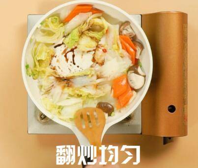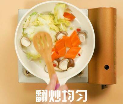 倒入白菜、香菇、胡萝卜片,翻炒均匀。