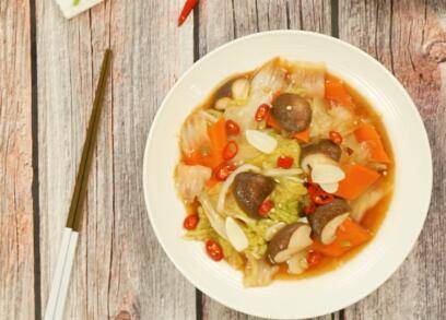 准备食材:胡萝卜100克、白菜300克。辅料:葱花5克、蒜片3克、辣椒1根、香菇80克、食用油5毫升。