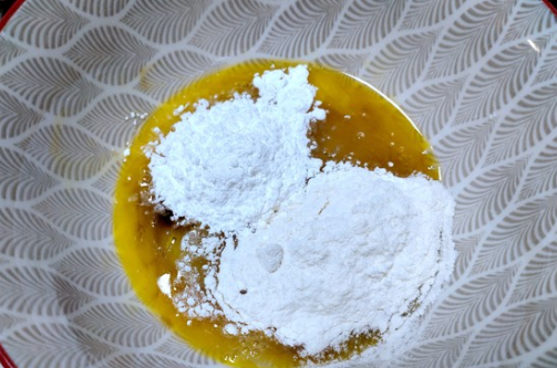 放入面粉和淀粉,搅拌至粘稠没有颗粒。面粉和淀粉的比例是2:1;