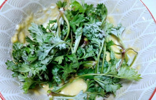 艾蒿去掉干叶子和根,洗净控干水分,放入面糊中搅拌均匀,让艾蒿都均匀的沾上面糊;