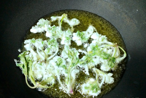 起锅烧油,油温至六成热,下入处理好的面糊艾蒿,大火炸制两面焦黄即可出锅,这个过程不到一分钟,要时刻注意锅中食材的情况,防止炸糊。