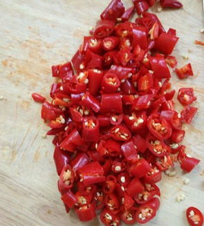 将长红尖椒剁碎;