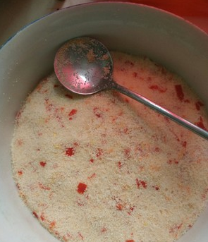 将盐放入辣椒碎中混合,盐要参考大米碎和辣椒的重量放;