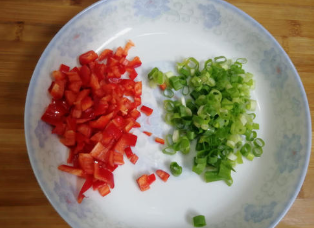 葱切成葱花,红辣椒切碎。