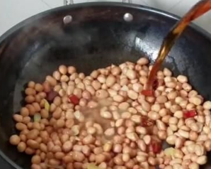 锅烧热放入适量的油,油烧热后倒入切碎的花生米,翻炒至变色后加入葱花和辣椒。