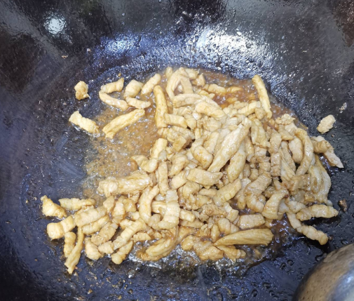 锅烧热用油滑锅,然后放冷油,炒肉丝,炒出油,放生抽和耗油,煸炒上色。不要用老抽,不然颜色太重了。