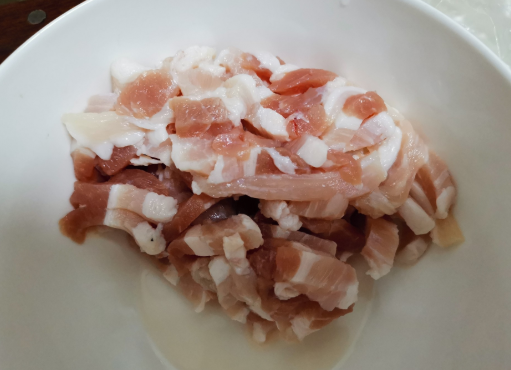 将五花肉切成肉丝,肉丝要宽一些。