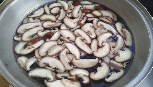香菇切片倒入开水中焯水断生;