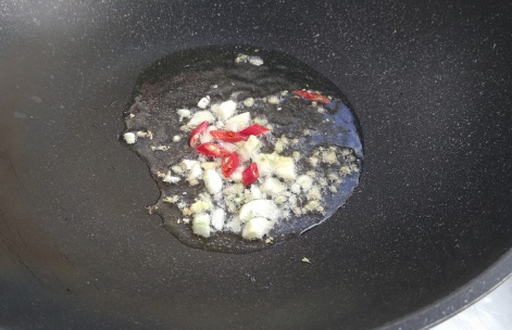 起锅烧油放入蒜片,姜末,辣椒圈爆出香味;