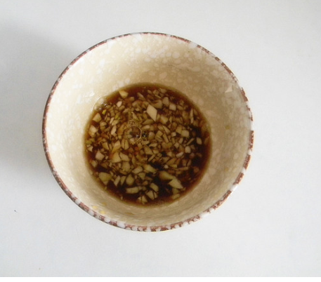 粉丝煮熟备用,蒜切末,放入1勺酱油、1勺蚝油、半勺白糖、1勺醋、盐半小勺、2勺开水拌匀;