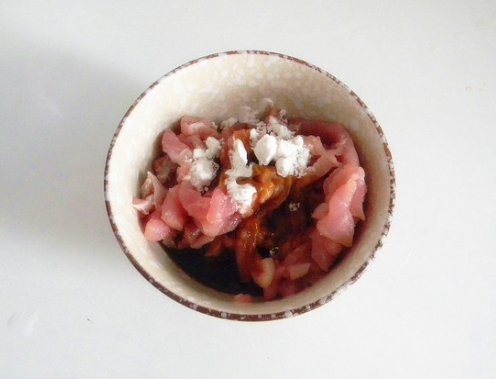 肉切丝,用1勺生抽和1勺淀粉拌匀腌渍5分钟;