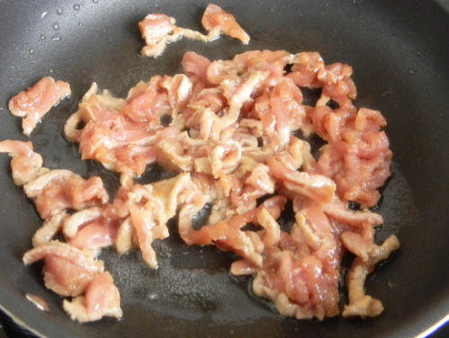 热锅放一点油,放入肉丝炒,肉丝炒变色,微微焦的状态;