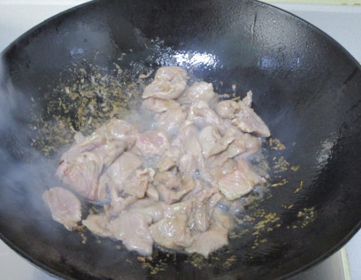 油温5成热,倒入肉片过油至全部变色后捞起
