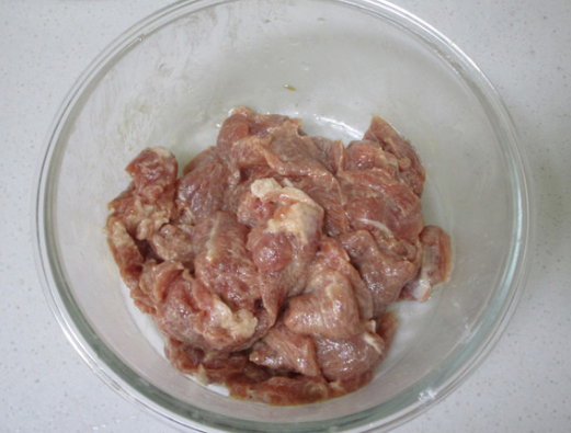 猪肉片里加入盐,料酒和生粉抓匀后静置半小时