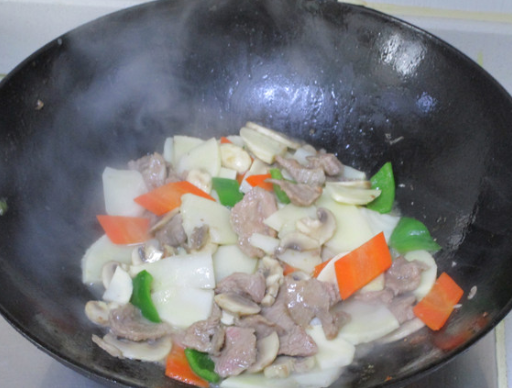 烹入少许开水烧至断生,再把肉片回锅烧制片刻后熄火出锅