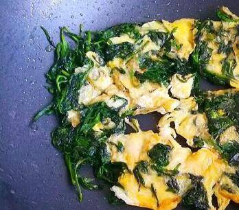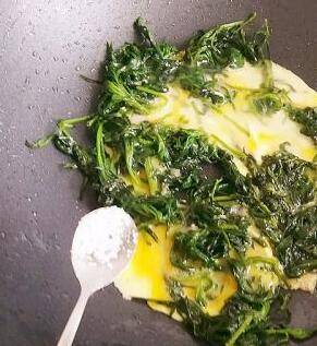 等鸡蛋液底部定型翻炒此菜,直至将此菜烧熟即可,野艾草叶子粘满鸡蛋才好吃。