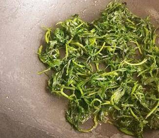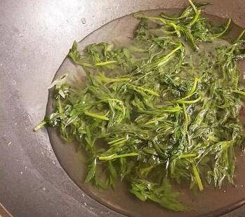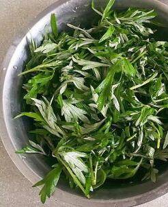 艾草叶子捞出放入镂空的篮子里控去水分,锅中倒入油烧至六成热,加入野艾草叶子翻炒;