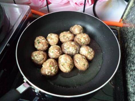 平底锅内另入少许油烧热,放入酿好的花菇,煎至底部微黄。