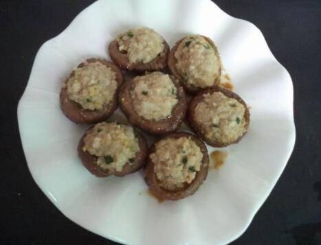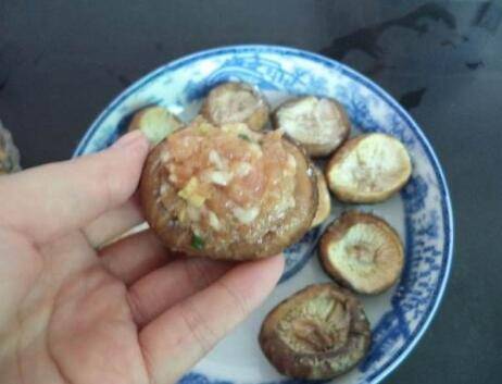 花菇拍上少许干淀粉,将肉沫酿入花菇内。
