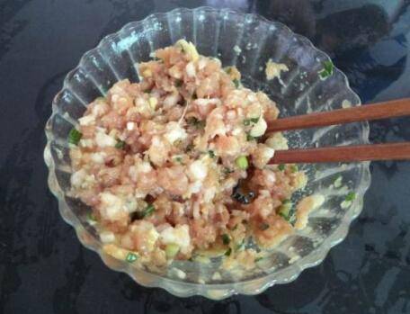 猪肉碎成肉末,加入盐、姜、葱花、酱油、胡椒粉、香油、淀粉、蚝油,拌匀。
