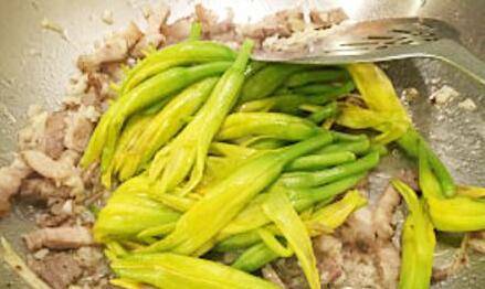 将煮熟的金针花倒进锅里,翻炒几下。